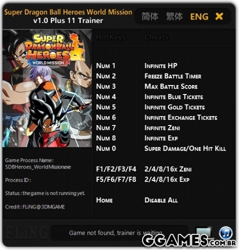 Numpad 1 - Infinite HP Numpad 2 - Freeze Battle Timer Numpad 3 - Max Battle Score Numpad 4 - Infinite Blue Tickets Numpad 5 - Infinite Gold Tickets Numpad 6 - Infinite Exchange Tickets Numpad 7 - Infinite Zeni Numpad 8 - Infinite Exp Numpad 0 - Super Damage/One Hit Kill F1/F2/F3/F4 - 2/4/8/16x Zeni F5/F6/F7/F8 - 2/4/8/16x Exp Home - Disable All Atenção: As instruções abaixo é para a versão original. Se utiliza a versão crackeada, não precisa fazer isso.