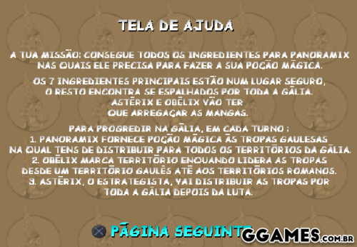 O gaulês favorito de todos e seu característico personagem paralelo nesta curiosa mistura de estratégia e ação arcade. No jogo, você vai liderar uma campanha para recapturar a Gália dos romanos irritantes, jogando um jogo de estratégia simples e usando muita poção mágica. O jogo também possui seções semelhantes a arcada, onde você poderá testar seus músculos e reflexos em vez de seu cérebro.