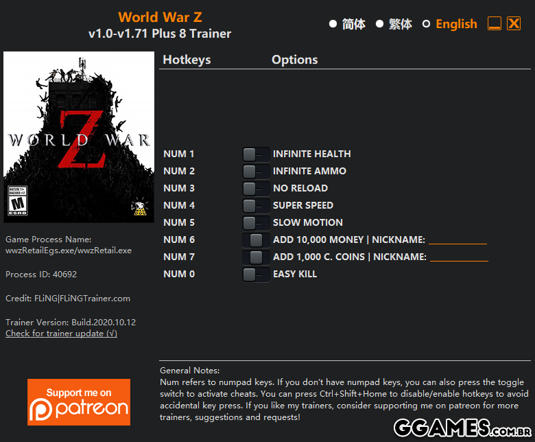 Trainer World War Z {FLiNG} v1.0-v1.71 Plus 8