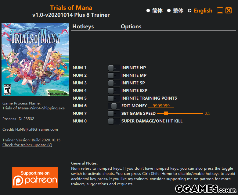 “Infinite Training Points” enter the training menu to see the value change. Note when leveling up or loading save file, training points may reset to normal or 0, you can use this option again to get training points.