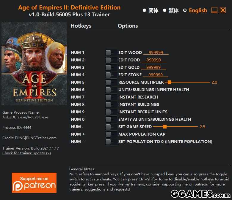Trainer Age of Empires 2: Definitive Edition {FLING} V1.0-BUILD.56005 plus 13
