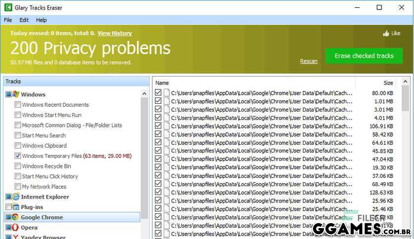 Contando com um mecanismo de varredura robusto, Glary Tracks Eraser pode analisar áreas importantes do seu computador para detectar arquivos desnecessários, exibindo todas as suas descobertas de maneira organizada. Ele recupera documentos acessados recentemente, itens do menu iniciar, uma lista de pesquisas realizadas que o Windows lembra, itens armazenados na área de transferência, arquivos temporários e conteúdo da Lixeira. Com apenas um clique, você pode se livrar desses itens.