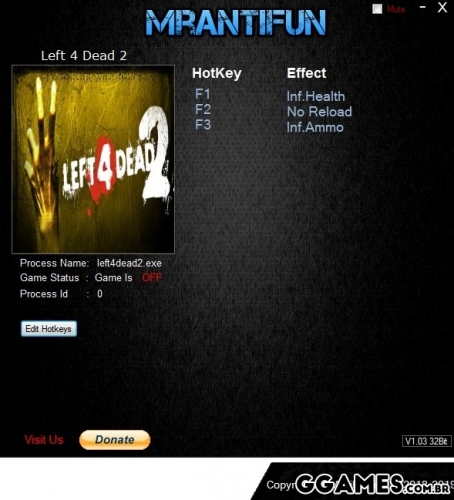 Visulizar Arquivo Trainer Left 4 Dead 2 {MrAntiFun} Trainer options F1 - Infinite Health F2 - No Reload F3 - Infinite Ammo Important: Please guys dont use it on online servers or you will get VAC banned, I warned dont come and complain if you get banned. First start single player game then activate cheats ,It may take the cheat up to 15 seconds to activate. Autor 403 - Forbiddeen Enviado 26-05-2019 Categoria Cheats / Trainers / Mods