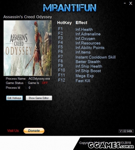 Visulizar Arquivo Trainer Assassin's Creed: Odyssey {MrAntiFun} Trainer options F1 - Infinite Health F2 - Infinite Adrenaline F3 - Infinite Oxygen F4 - Infinite Resources F5 - Infinite Ability Points F6 - Infinite Items F7 - Instant Cooldown skill F8 - Better Stealth F9 - Infinite Ship Health F10 - Infinite Ship Boost F11 - Mega Experience F12 - Fast Kill Notice: You should have a game backup before using the Trainer to be sure nothing goes wrong because progress in this game takes time, Save older location is at C:\Program Files (x86)\Ubisoft\Ubisoft Game Launcher\savegames\YourUbisoftID\5092 or 5059. You must have at least 1 of the resource for the resources cheat to effect it. Autor 403 - Forbiddeen Enviado 26-05-2019 Categoria Cheats / Trainers / Mods