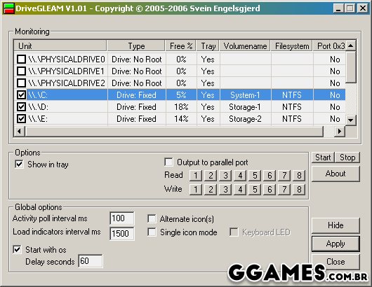 DriveGLEAM é um monitor de atividades do HD, que exibe na barra de tarefas do sistema indicações verdes e vermelhas, como as vistas nos leds do gabinete.