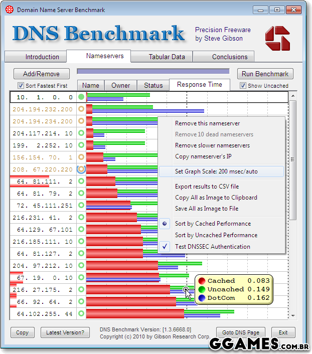 O DNSBench realiza uma análise e comparação detalhadas do desempenho operacional e da confiabilidade de qualquer conjunto de até 200 servidores de nomes DNS de uma só vez.