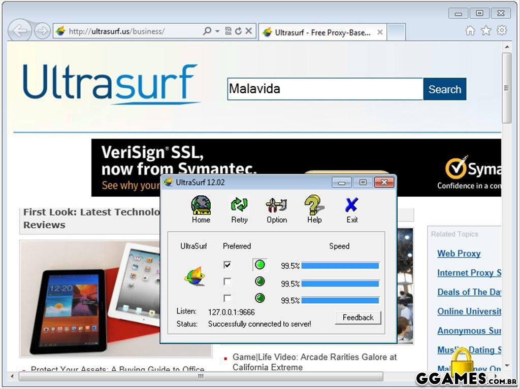 O UltraSurf é um programa, para Windows( Internet Explorer ) e Firefox, que permite acessar qualquer página da Web bloqueada sem deixar rastro algum. Com a ferramenta "em mãos", é possível navegar anonimamente. O histórico é apagado automaticamente, assim que o usuário terminar de utilizá-la.