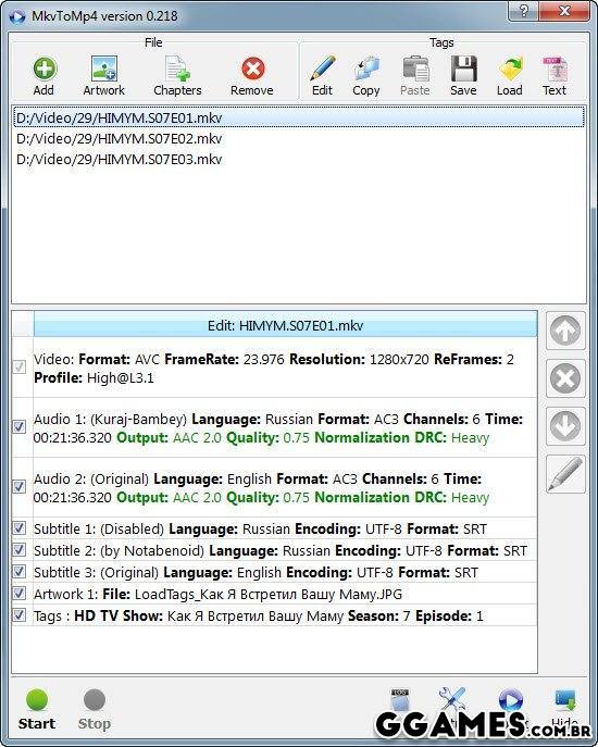 MkvToMp4 pode alterar mkv para Mp4 sem reconverter / transcodificar o vídeo (se o vídeo original estiver no formato H264). Suporte para várias faixas de áudio internas e externas. Suporte formatos de legenda: srt, ass, ssa, ttxt. Alterando cores para legendas. Adicione e edite tags para arquivos Mp4 (m4v, m4a, m4b).